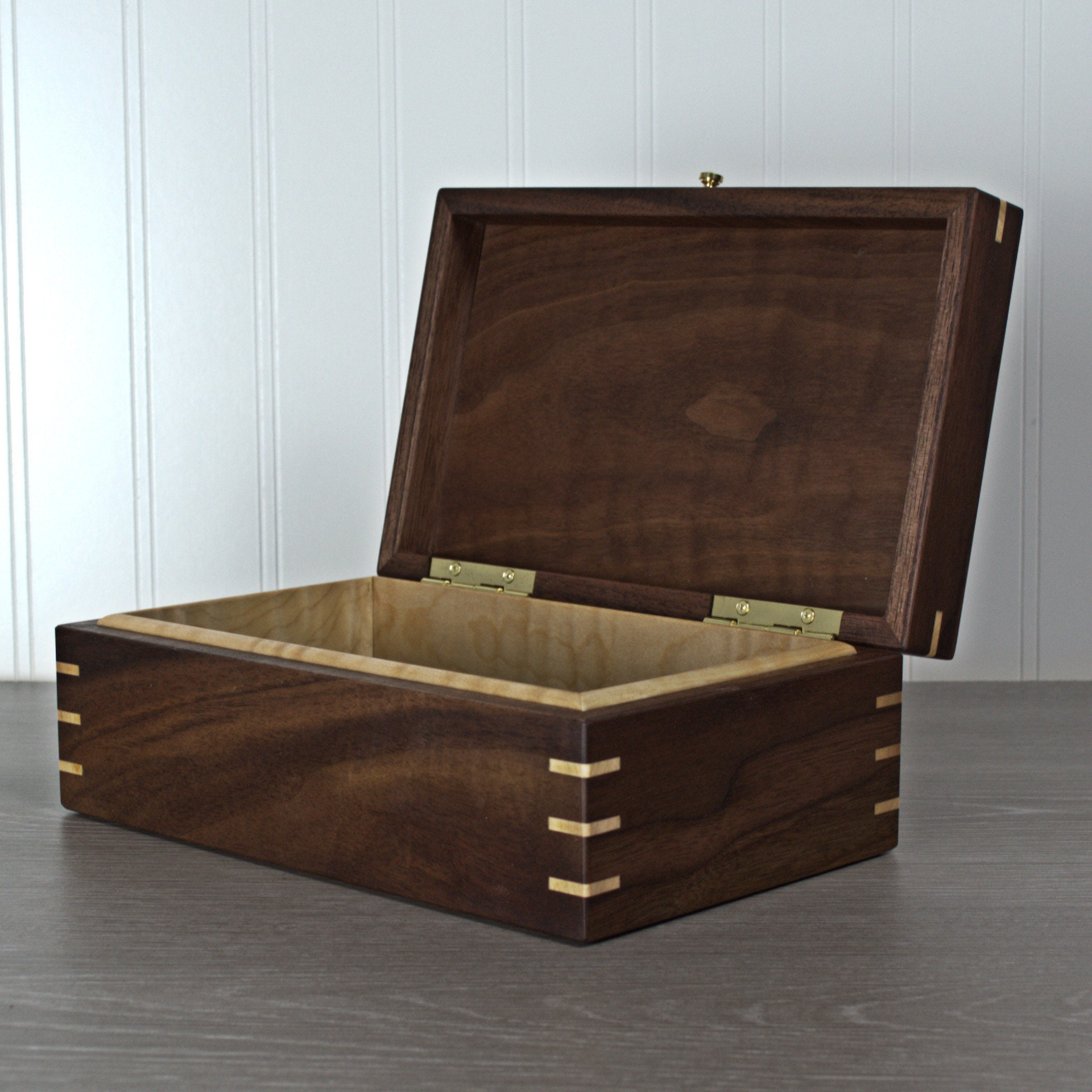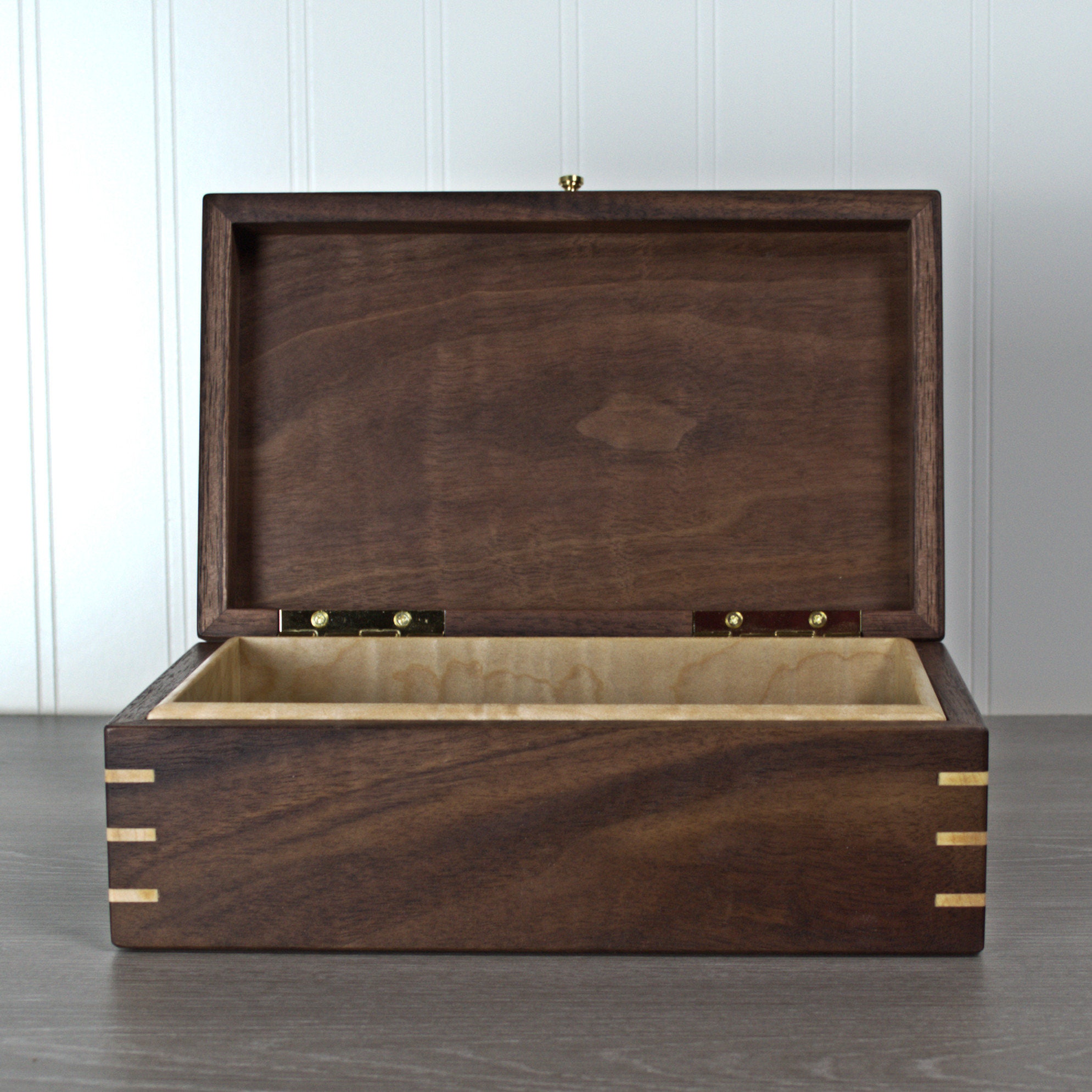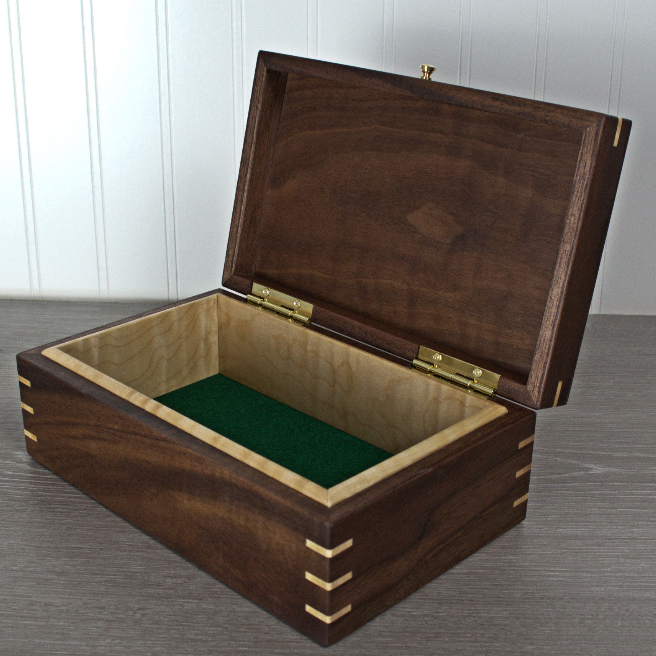 Introducing my exquisite handmade black walnut keepsake/jewelry box, a timeless and elegant piece that is perfect for preserving your most treasured possessions. The box features mitered corners with maple miter splines for added strength and beauty, ensuring durability and longevity. The inside of the box is lined with stunning curly maple, while the bottom is covered in soft green felt, providing a luxurious and protective environment for your items. With outside dimensions of 9 x 4-1/2 x 3-1/2 inches and inside dimensions of 7-1/2 x 4 x 2 inches, this box is just the right size to display on a dresser or shelf. The hand-rubbed oil and wax finish accentuates the amazing grain detail of the black walnut, making this keepsake box a truly exceptional piece of craftsmanship. What's more, the maple liner and felt bottom are removable, offering versatile storage options for your precious belongings.