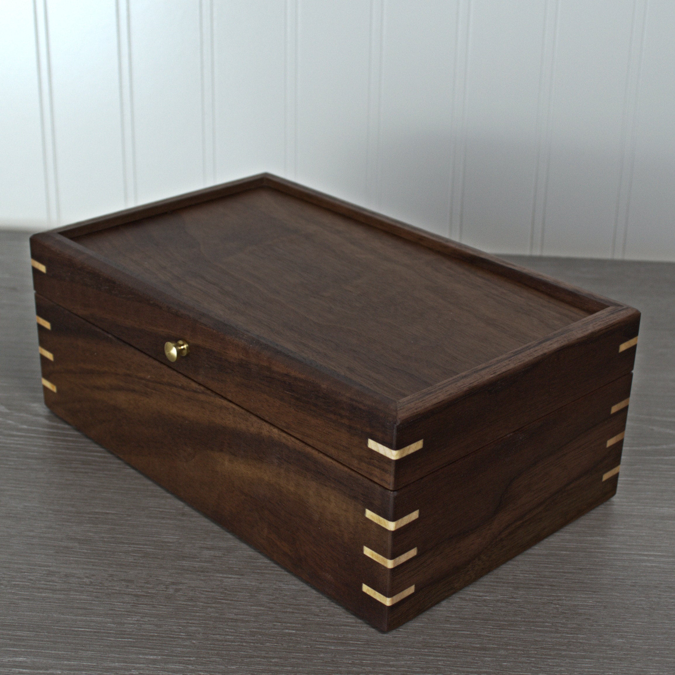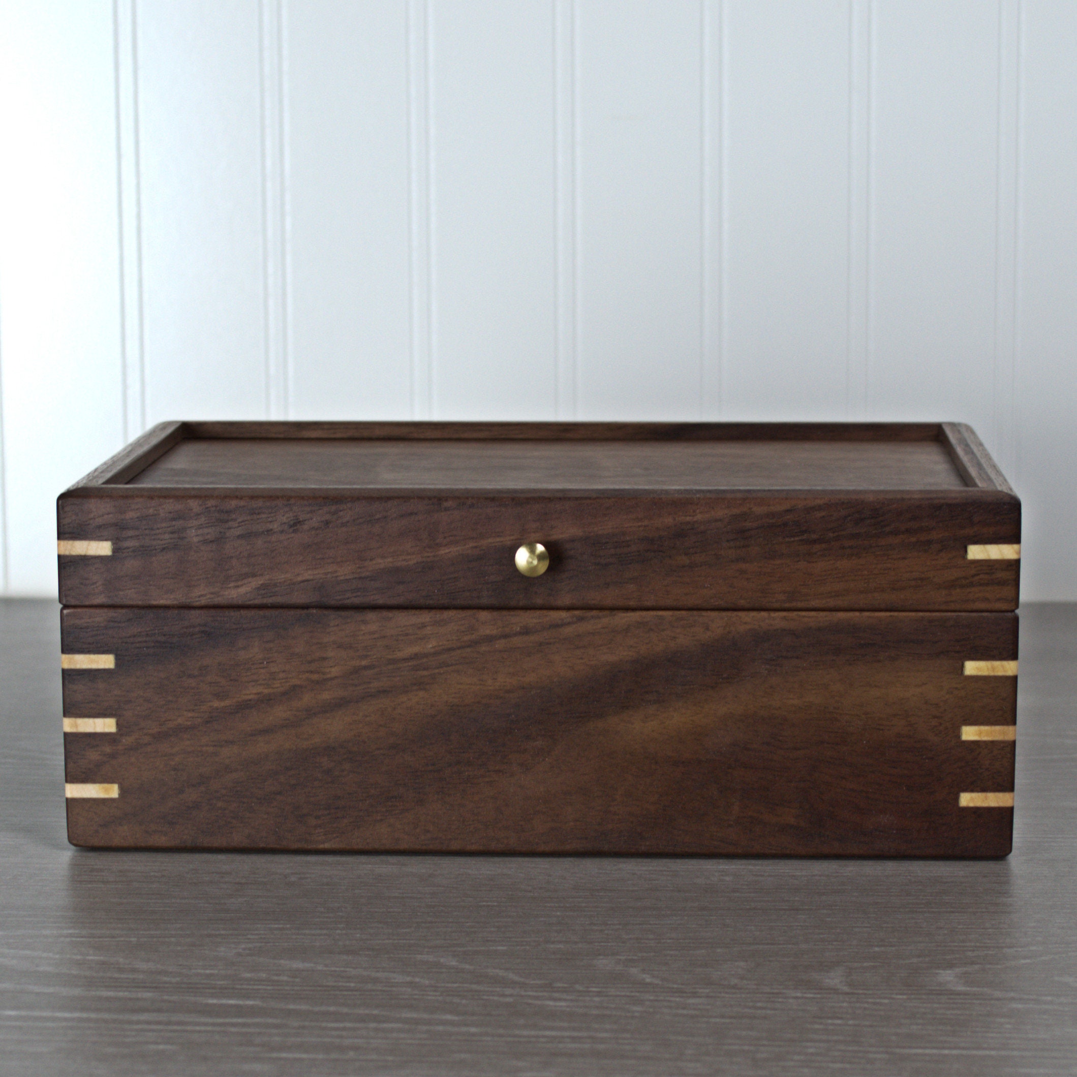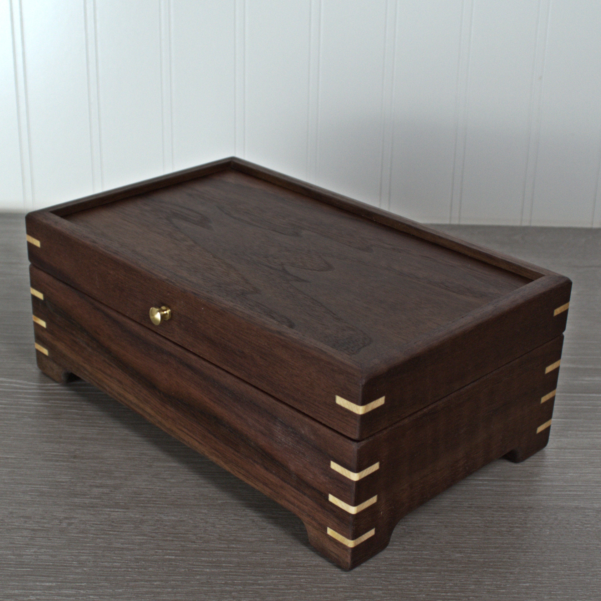 Introducing my exquisite handmade black walnut keepsake/jewelry box, a timeless and elegant piece that is perfect for preserving your most treasured possessions. The box features mitered corners with maple miter splines for added strength and beauty, ensuring durability and longevity. The inside of the box is lined with stunning curly maple, while the bottom is covered in soft green felt, providing a luxurious and protective environment for your items. With outside dimensions of 9 x 4-1/2 x 3-1/2 inches and inside dimensions of 7-1/2 x 4 x 2 inches, this box is just the right size to display on a dresser or shelf. The hand-rubbed oil and wax finish accentuates the amazing grain detail of the black walnut, making this keepsake box a truly exceptional piece of craftsmanship. What's more, the maple liner and felt bottom are removable, offering versatile storage options for your precious belongings.