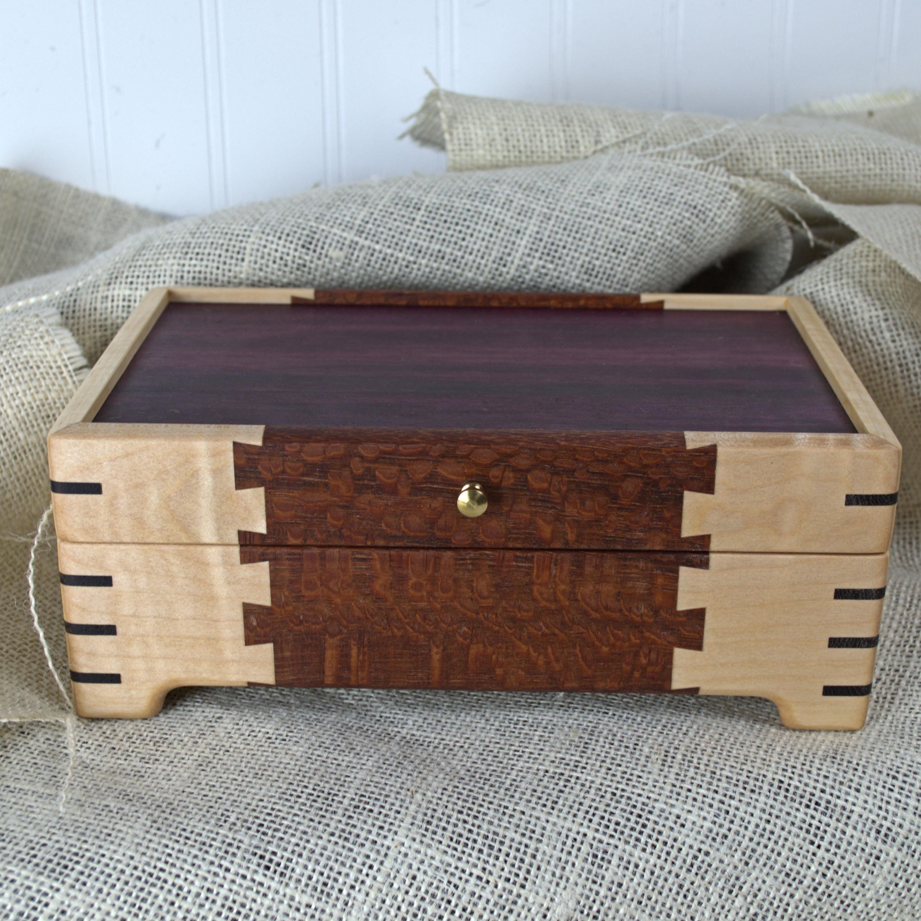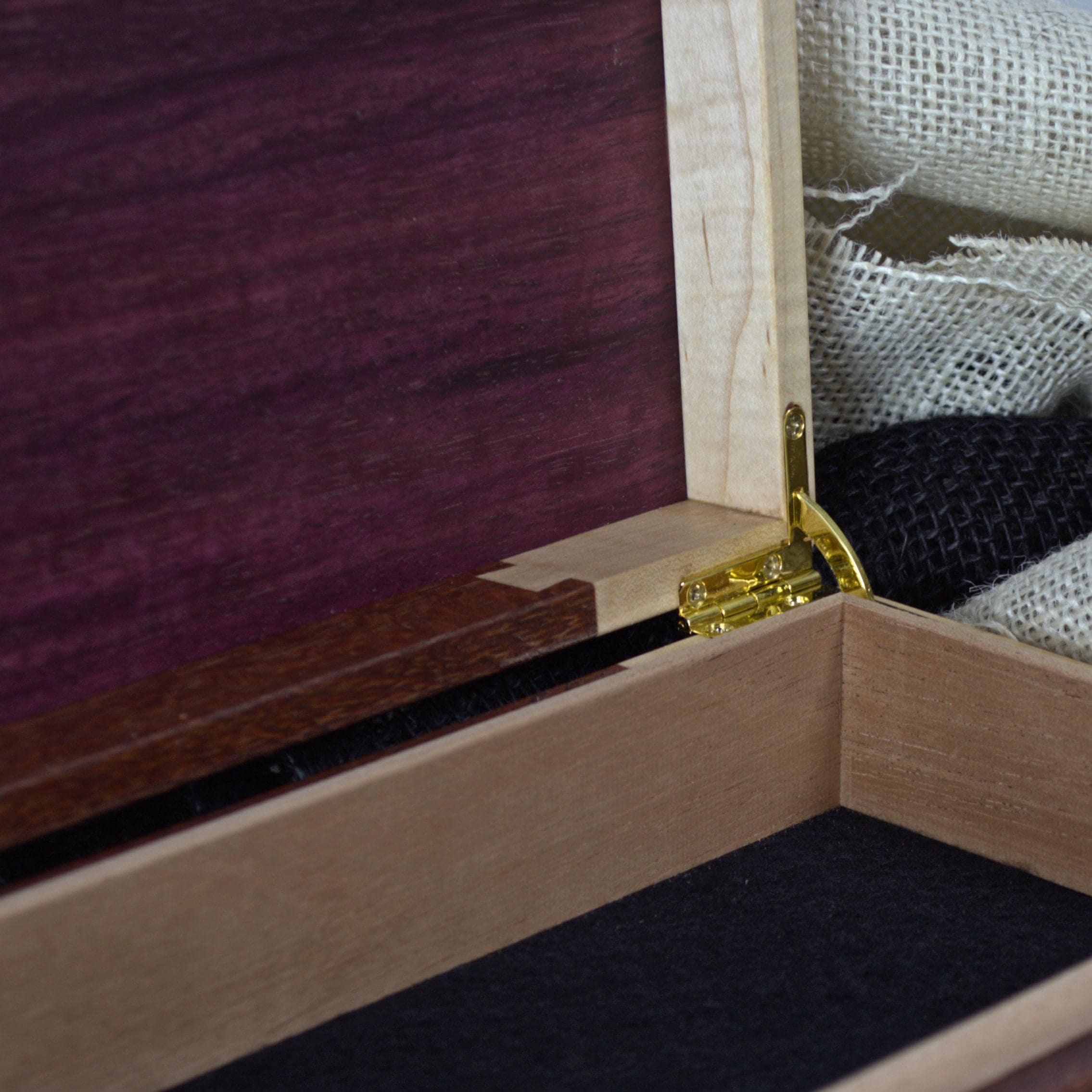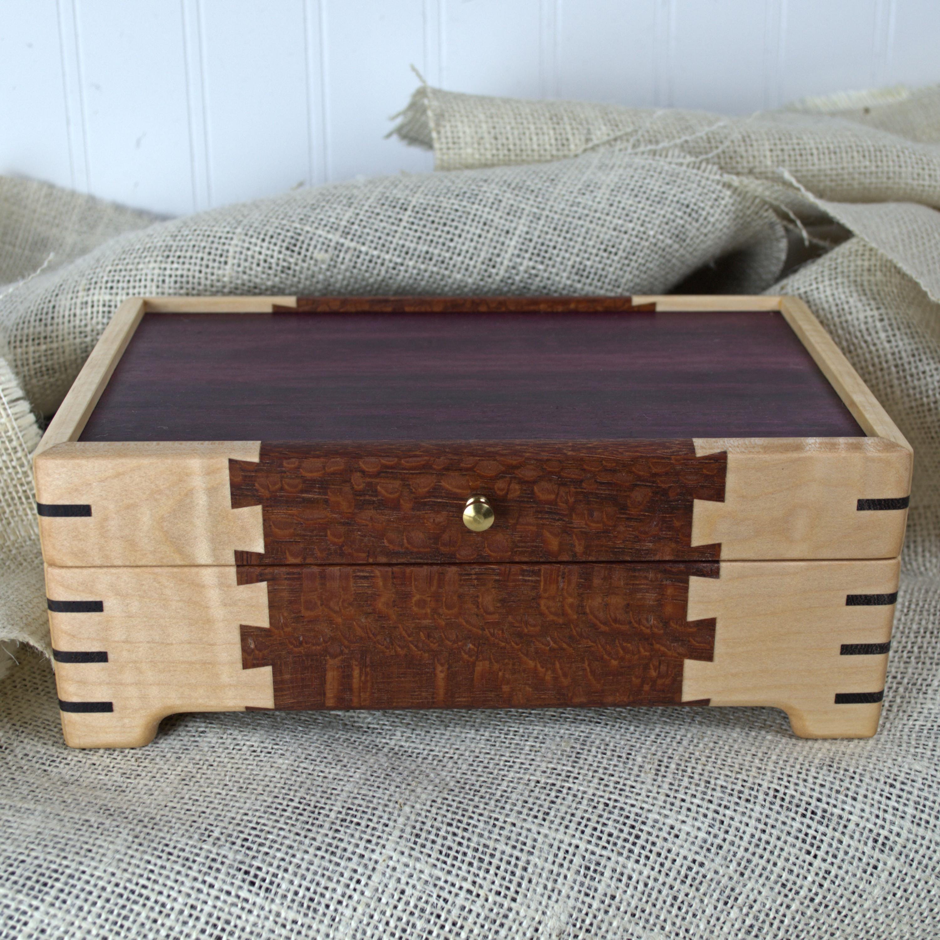 Presenting an exquisite handmade Curly Maple and Leopard Wood keepsake/jewelry box. This timeless and elegant piece is perfect for preserving your most treasured possessions. Dovetail joinery between the Leopard Wood and Curly Maple adds a detail that captures your attention and sets this box apart. The box features mitered corners with black walnut miter splines for added strength and beauty, ensuring durability and longevity. The Purple Heart lid gives this box an elegant and unique look. The inside of the box is lined with Spanish Cedar, while the bottom is covered in soft black felt, providing a luxurious and protective environment for your items. The solid brass quadrant hinges give this box a high-end function and feel. With outside dimensions of 9 x 5-1/2 x 3-1/2 inches and inside dimensions of 7-3/4 x 4-1/4 x 1-3/8 inches, this box is just the right size to display on a dresser or shelf. The hand-rubbed oil and wax finish accentuates the amazing grain detail of the curly maple and Leopard Wood, making this keepsake box a truly exceptional piece of craftsmanship. Moreover, the Spanish Cedar liner and felt bottom are removable, offering versatile storage options for your precious belongings.