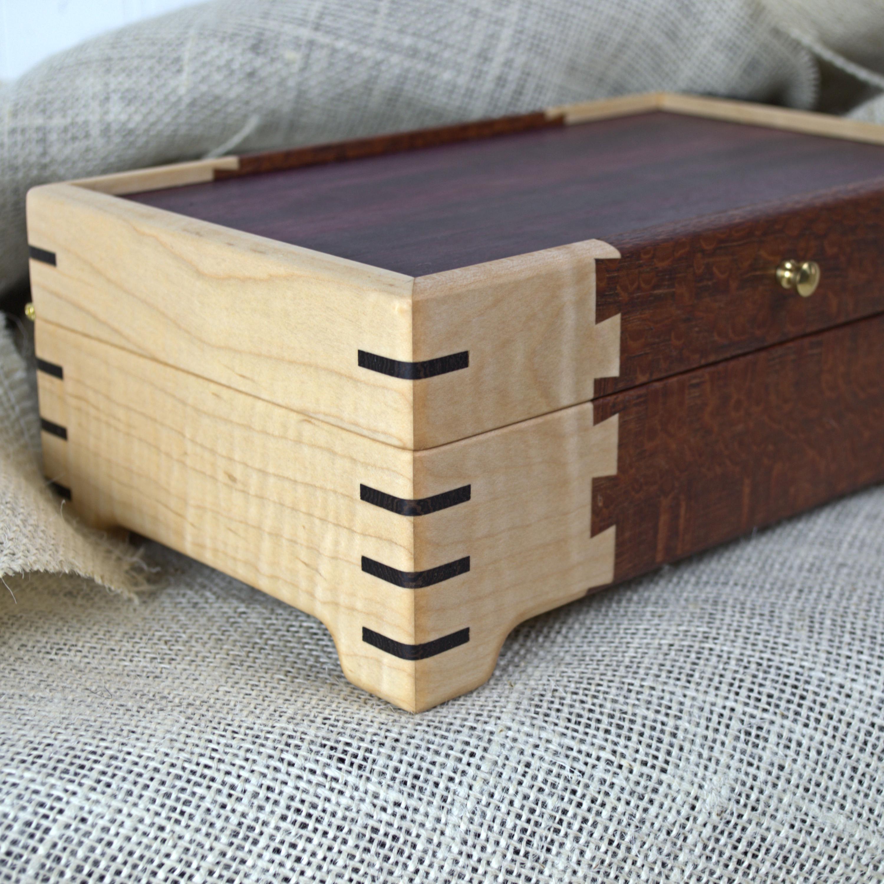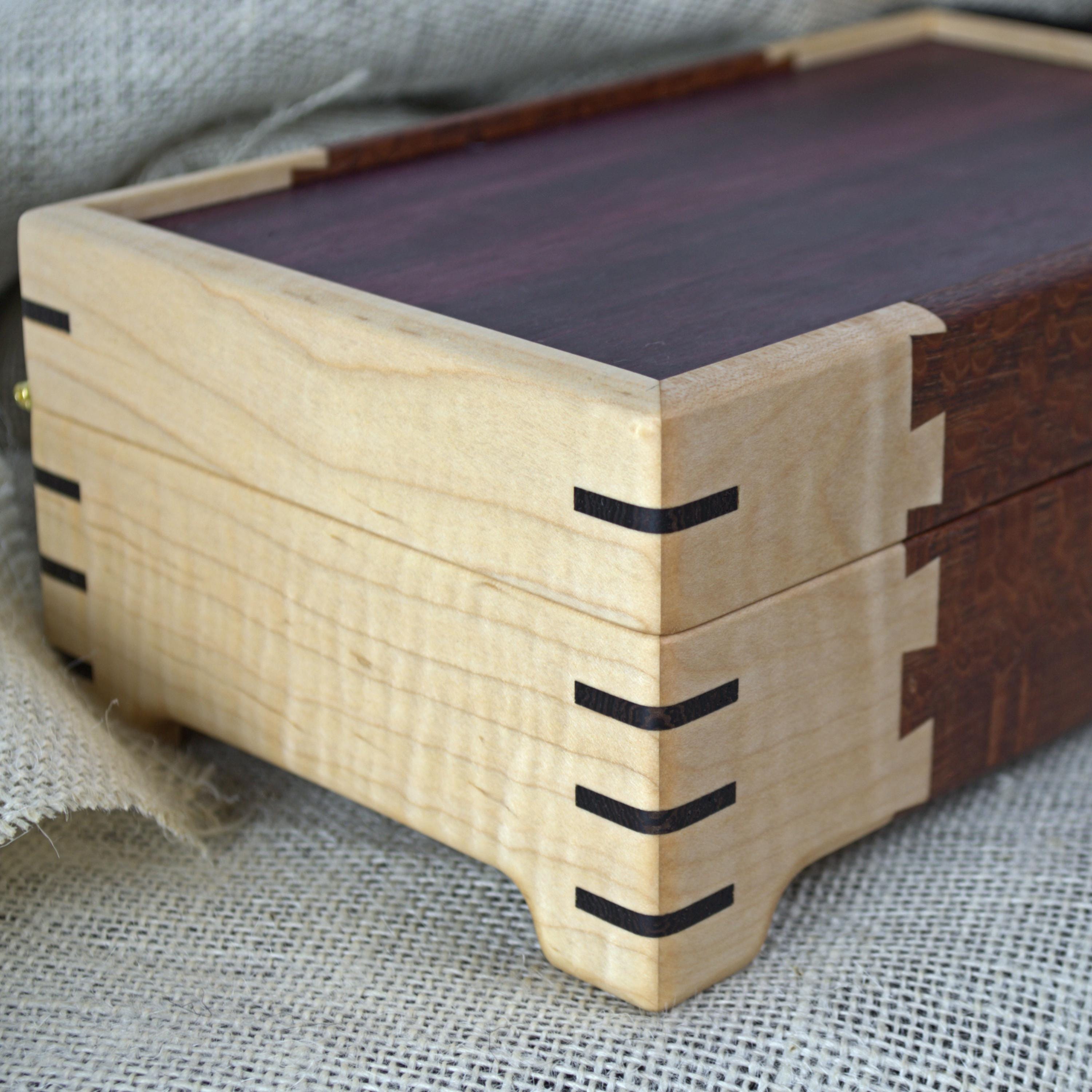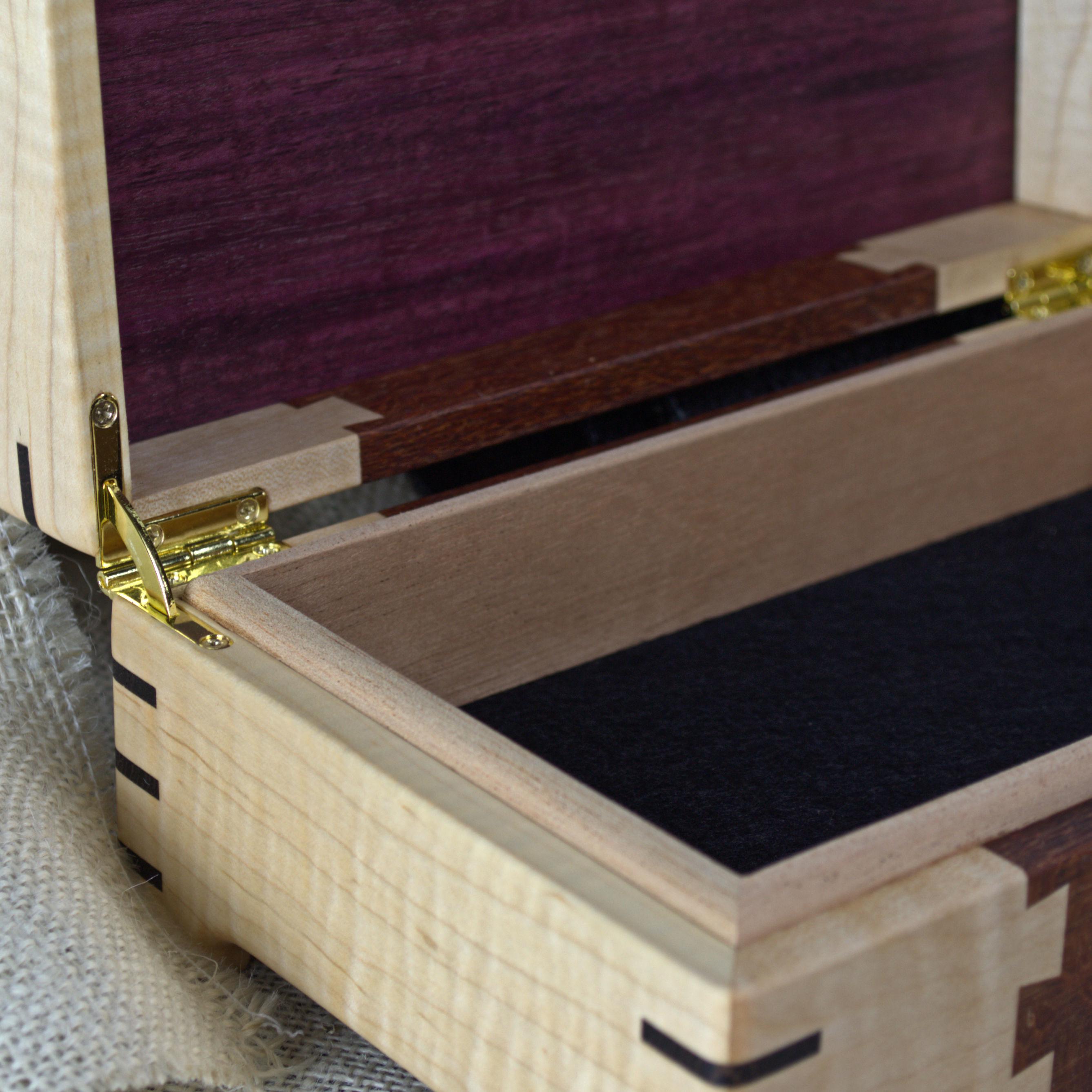 Presenting an exquisite handmade Curly Maple and Leopard Wood keepsake/jewelry box. This timeless and elegant piece is perfect for preserving your most treasured possessions. Dovetail joinery between the Leopard Wood and Curly Maple adds a detail that captures your attention and sets this box apart. The box features mitered corners with black walnut miter splines for added strength and beauty, ensuring durability and longevity. The Purple Heart lid gives this box an elegant and unique look. The inside of the box is lined with Spanish Cedar, while the bottom is covered in soft black felt, providing a luxurious and protective environment for your items. The solid brass quadrant hinges give this box a high-end function and feel. With outside dimensions of 9 x 5-1/2 x 3-1/2 inches and inside dimensions of 7-3/4 x 4-1/4 x 1-3/8 inches, this box is just the right size to display on a dresser or shelf. The hand-rubbed oil and wax finish accentuates the amazing grain detail of the curly maple and Leopard Wood, making this keepsake box a truly exceptional piece of craftsmanship. Moreover, the Spanish Cedar liner and felt bottom are removable, offering versatile storage options for your precious belongings.